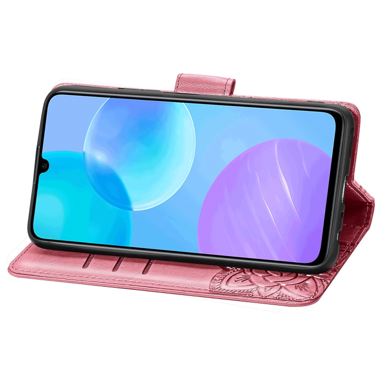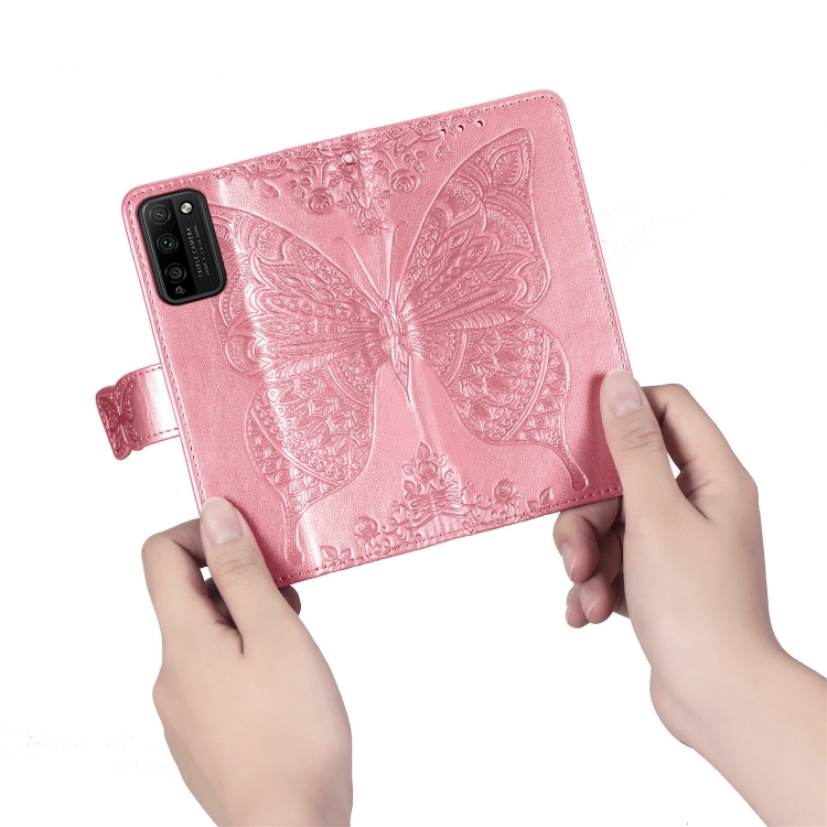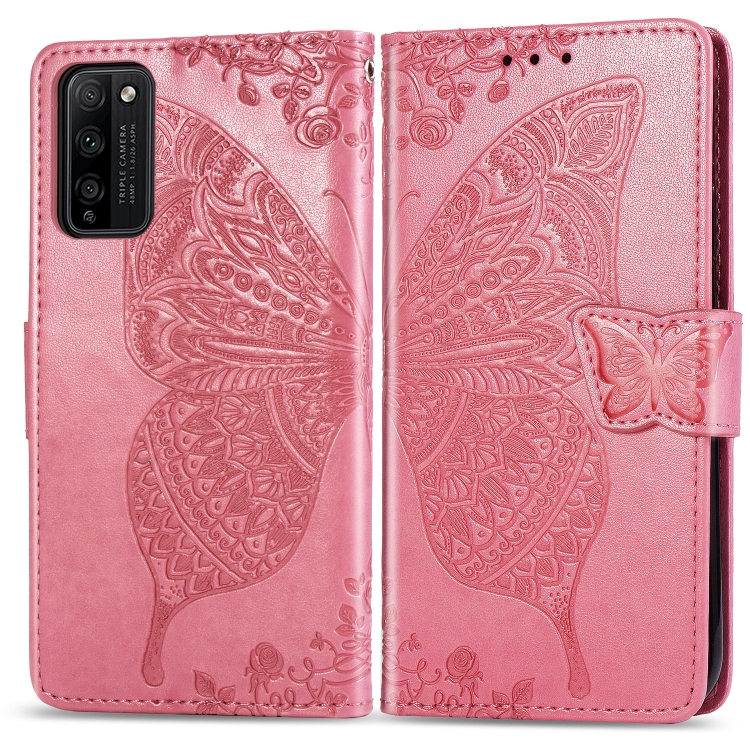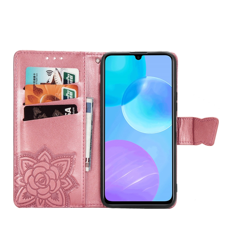 Para Huawei Honor 30 Lite Butterfly Love Flower Funda de cuero con tapa horizontal en relieve con soporte, ranuras para tarjetas, billetera y cordón (rosa)