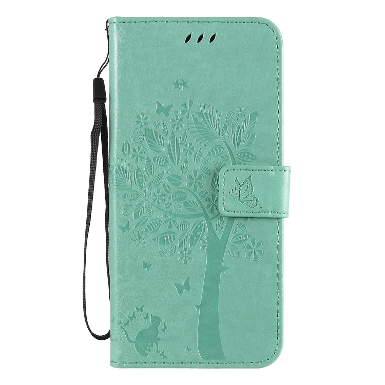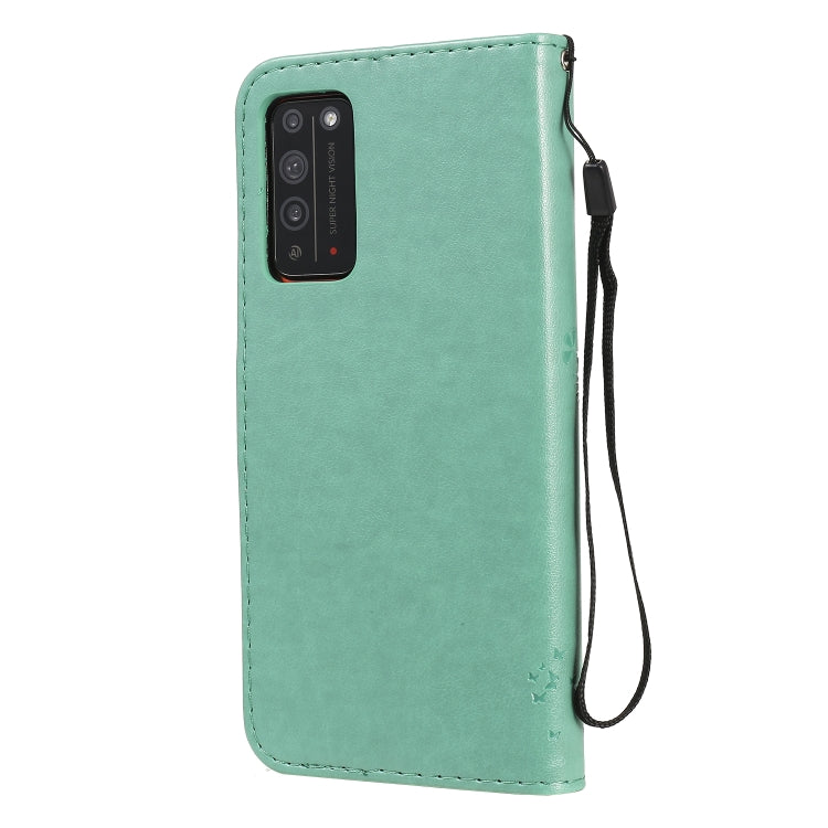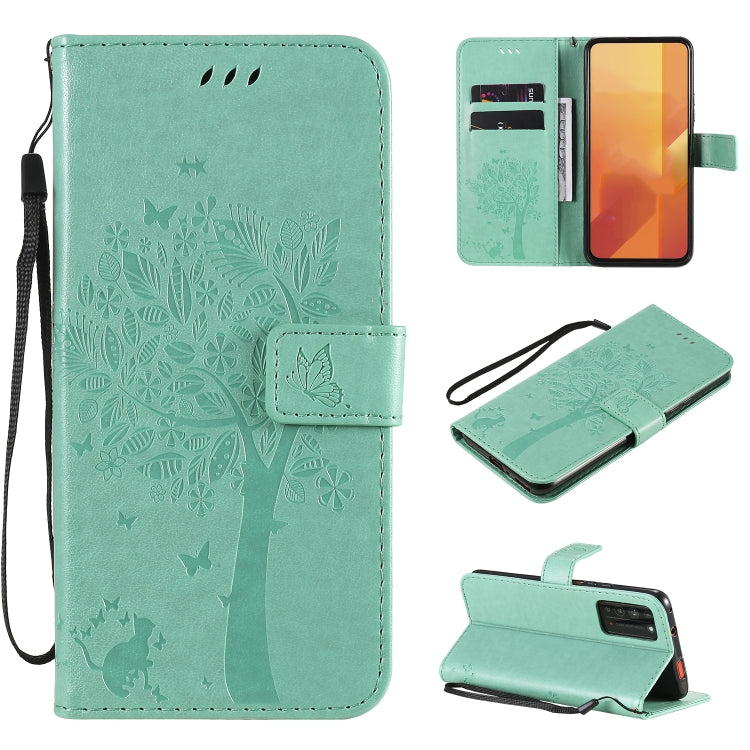 Funda de Cuero Huawei Honor X10 5G Árbol y Gato en Relieve con Tapa, Soporte, Ranuras y Cordón (Verde)