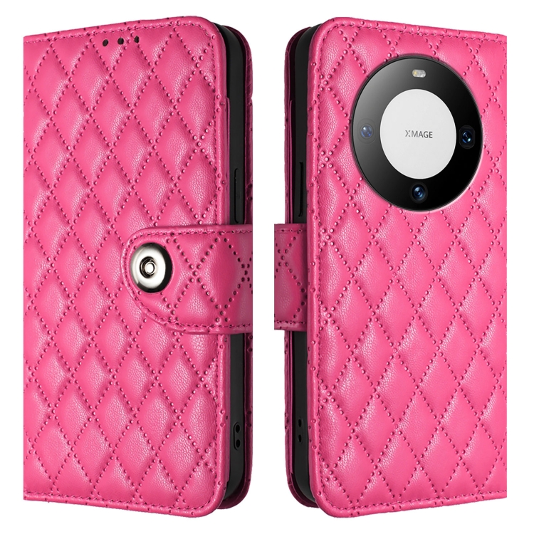 Funda de Cuero para Huawei Mate 60 con Tapa, Textura Rómbica y Cordón (Rojo Rosa)