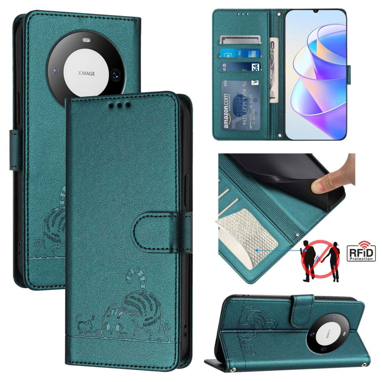 Funda para Huawei Mate 60 Pro y 60 Pro+ Cat Rat Cuero Rfid con Patrón en Relieve y Cordón (Verde Pavo Real)
