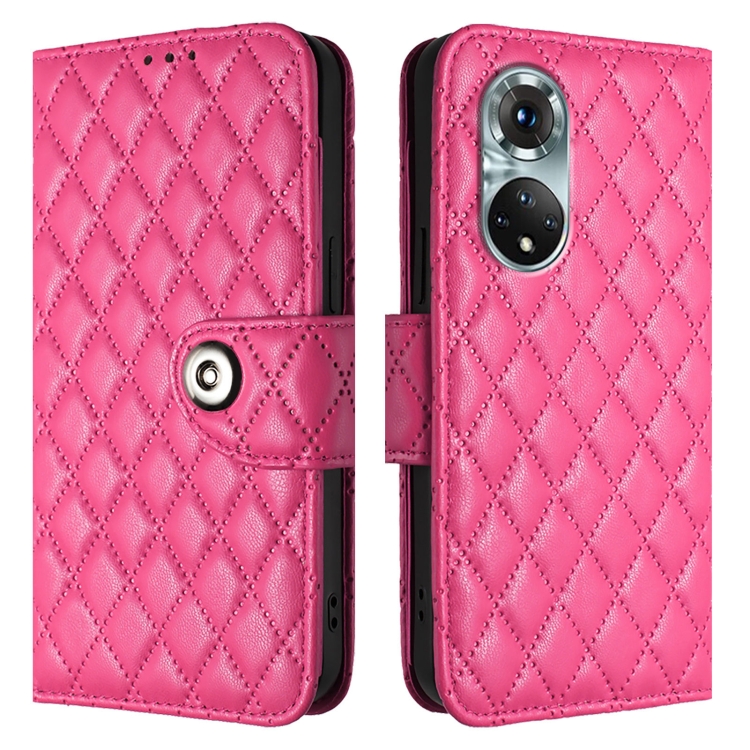 Funda de Cuero con Tapa para Huawei Nova 9 con Textura Rómbica y Cordón (Rojo Rosa)