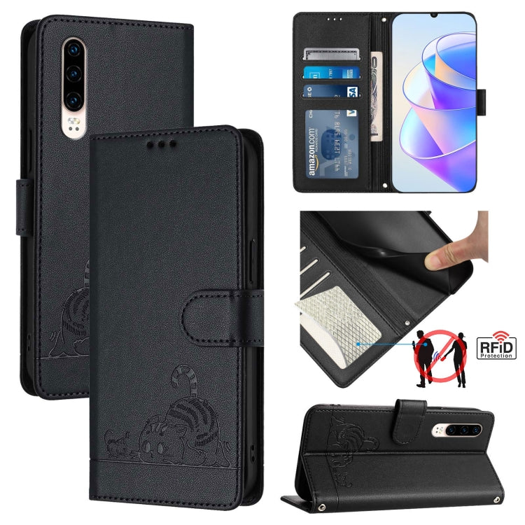 Funda para Huawei P30 de Cuero Rfid con Patrón en Relieve y Cordón (Negro)