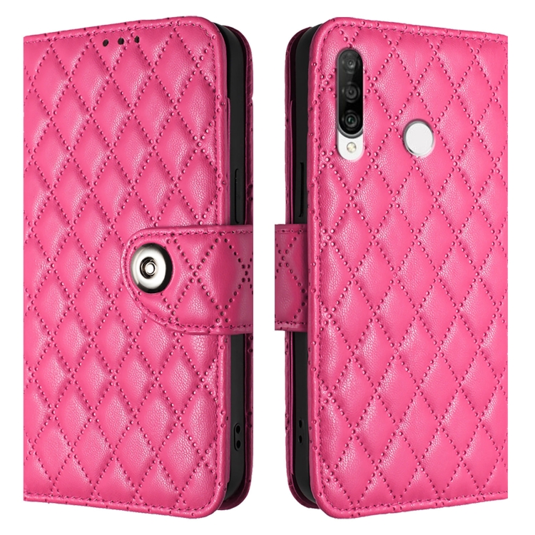 Funda para Huawei P30 Lite Nova 4E con Tapa de Cuero Textura Rómbica y Cordón (Rojo Rosa)