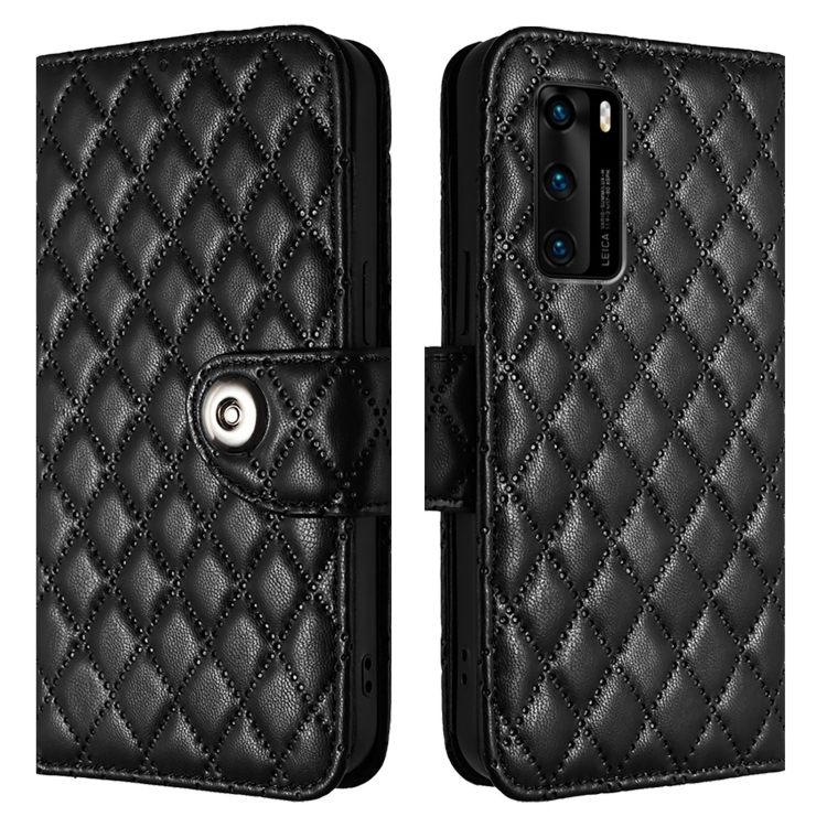 Funda de Cuero para Huawei P40 con Tapa Textura Rómbica y Cordón (Negro)