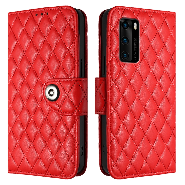 Funda de Cuero para Huawei P40 con Tapa, Textura Rómbica y Cordón (Rojo)