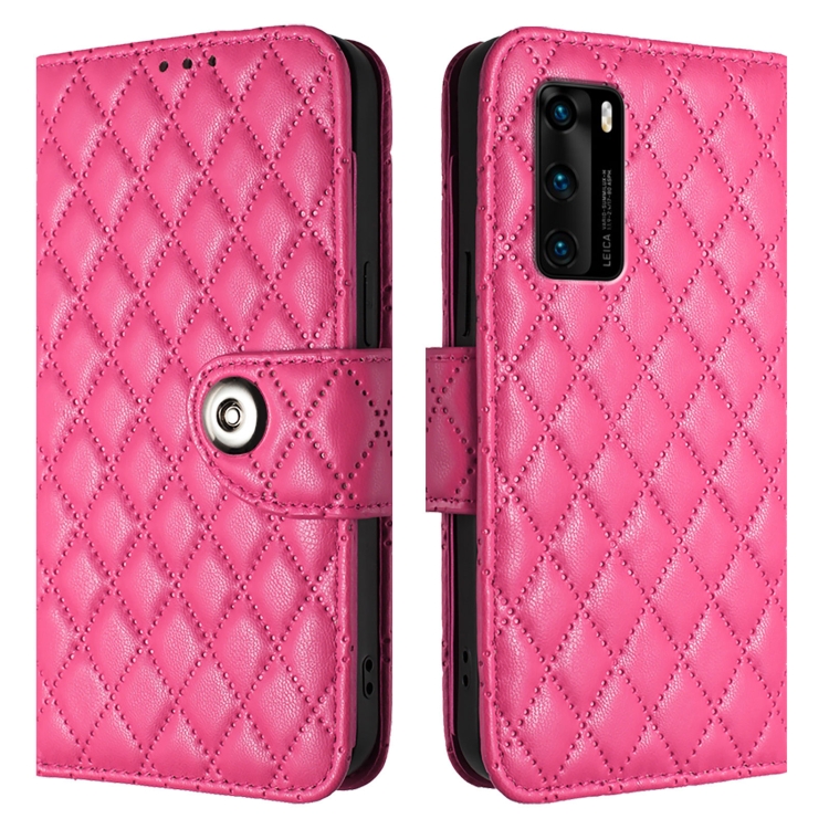 Funda de Cuero para Huawei P40 con Tapa Textura Rómbica y Cordón (Rojo Rosa)