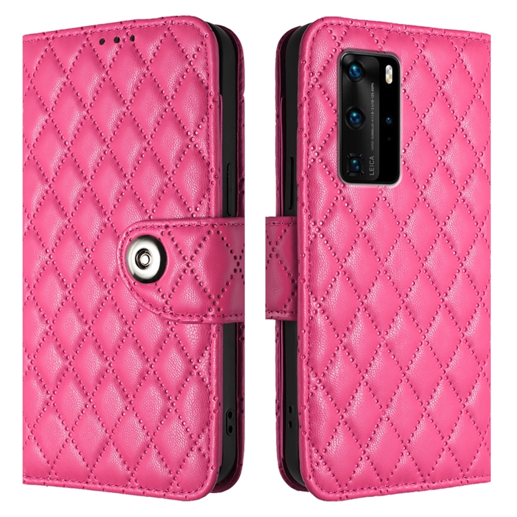 Funda de Cuero para Huawei P40 Pro con Tapa Textura Rómbica y Cordón (Rojo Rosa)