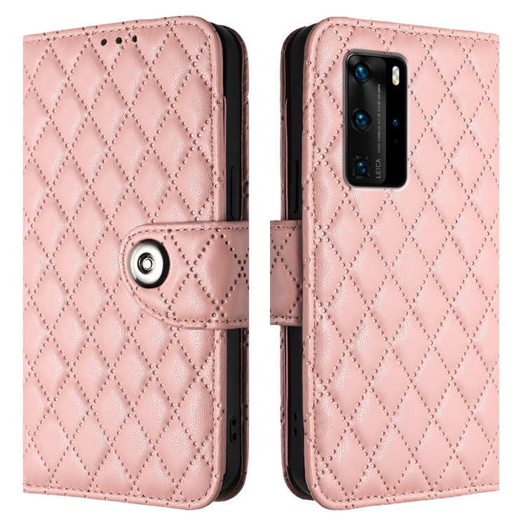 Funda de Cuero para Huawei P40 Pro con Tapa Textura Rómbica y Cordón (Rosa Coral)