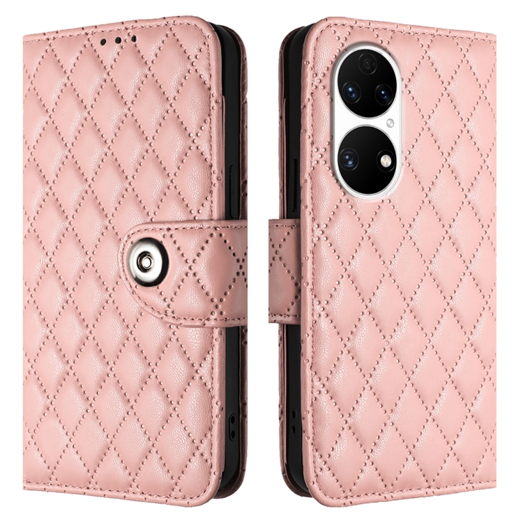 Funda de Cuero para Huawei P50 con Tapa Textura Rómbica y Cordón (Rosa Coral)