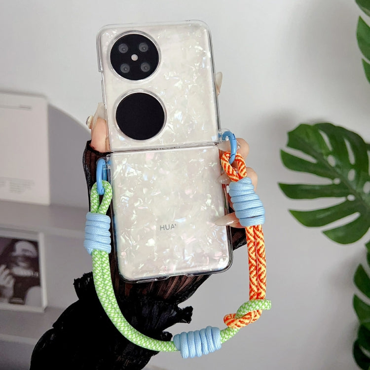 Funda para Huawei P50 con Hebilla Lateral y Textura Concha Nacarada con Pulsera (Beige)