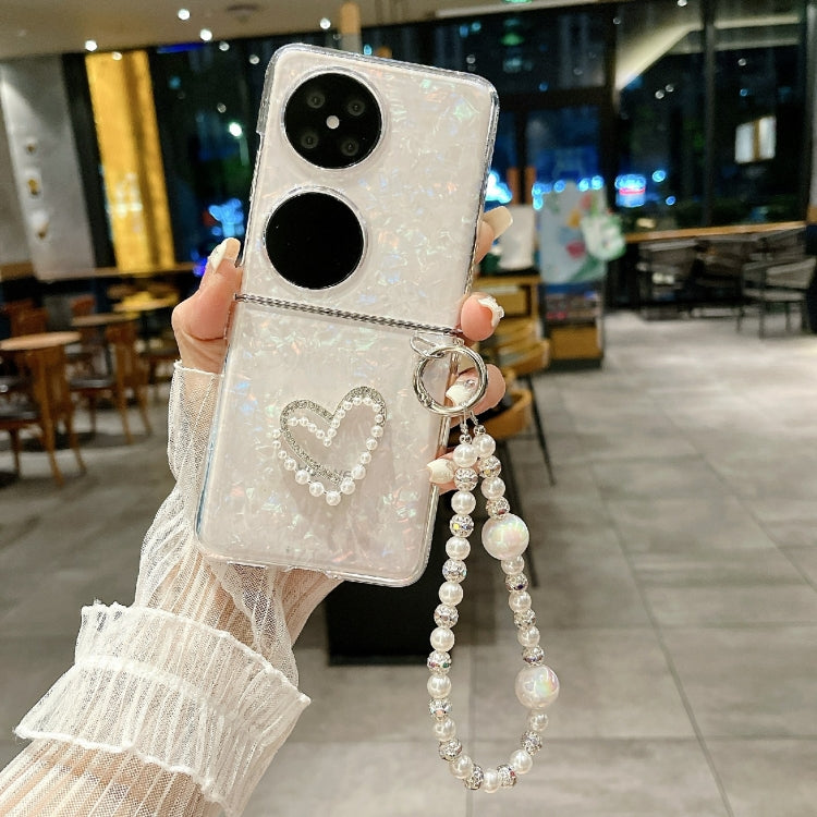 Funda para Huawei P50 con Patrón de Corazón y Textura de Concha Nacarada con Pulsera (Blanco)