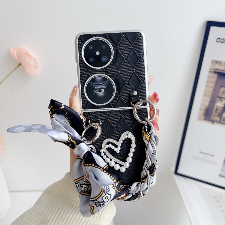 Funda para Huawei P50 Pocket con Textura de Cuero Rhombus y Pulsera Corazón a Prueba de Golpes (Negro)