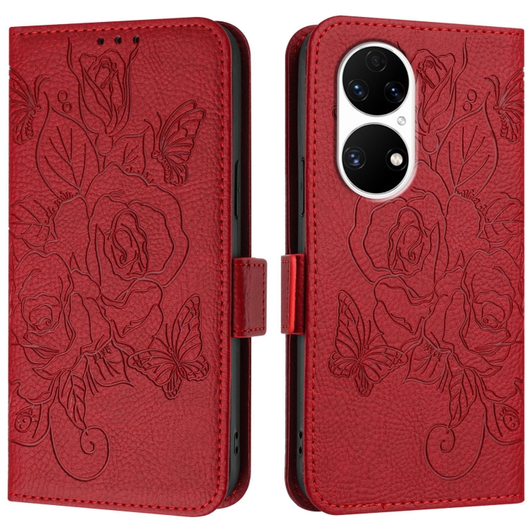 - 1x Funda de Cuero Antirrobo RFID para Huawei P50 Pro con Relieve Rosa (Rojo)