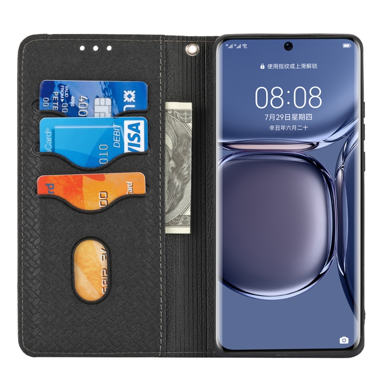 Para Huawei P50 textura tejida costura magnética Horizontal Flip PU Funda de cuero con soporte y ranuras para tarjetas y billetera y cordón (negro)