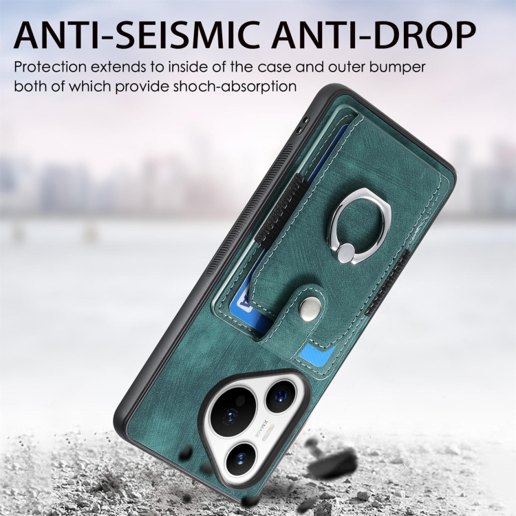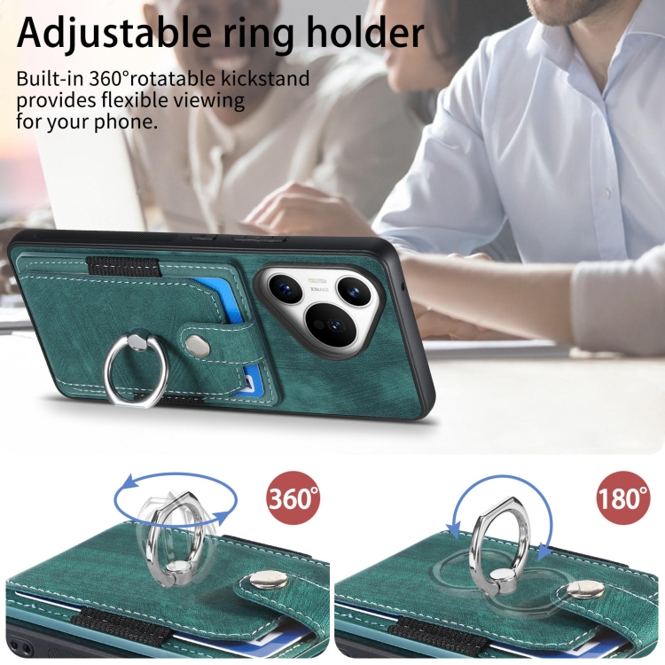 Funda para Huawei Pura 70 con Billetera, Tarjeta y Anillo, Sensación de Piel Retro (Verde)