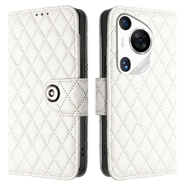 - 1x Funda de Cuero para Huawei Pura 70 Pro con Tapa Textura Rombal y Cordón (Blanco)