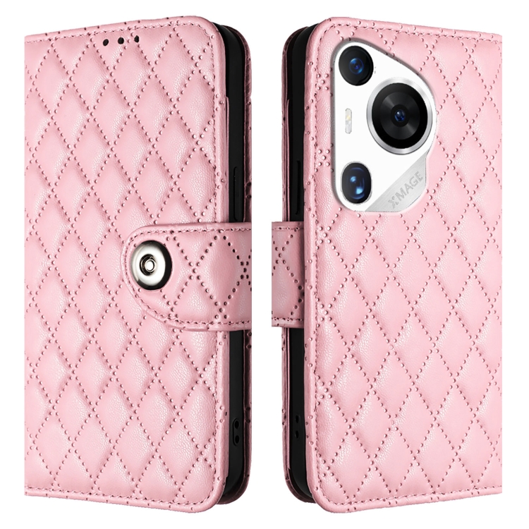Funda de Cuero para Huawei Pura 70 Pro con Tapa, Textura Rombal y Cordón (Rosa)