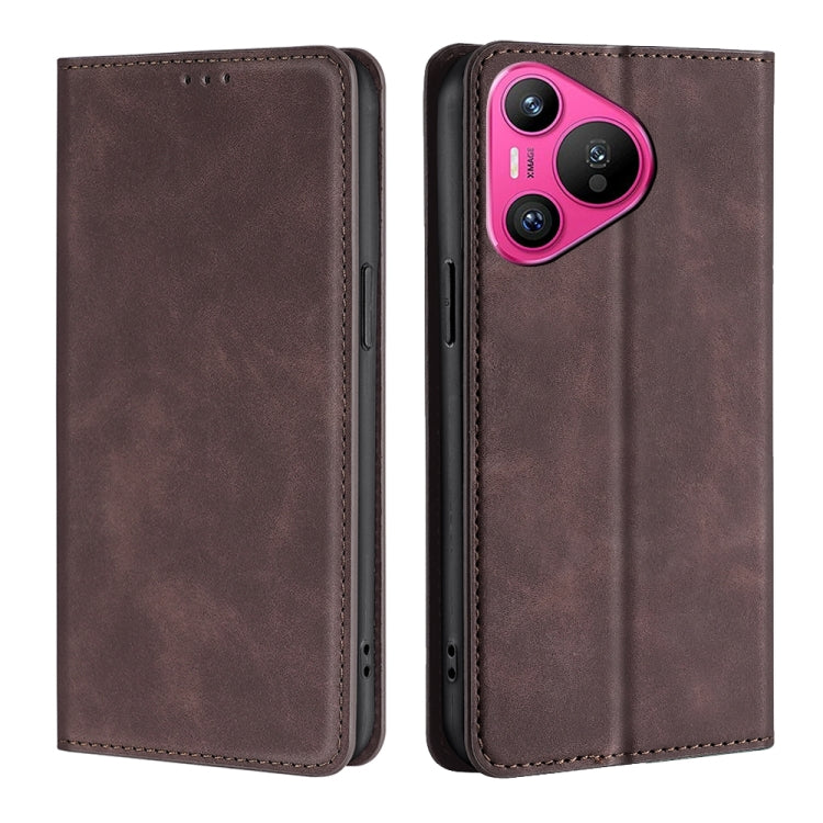 Funda de Cuero Magnética Huawei Pura 70 Skin Feel para Teléfono (Marrón Oscuro)