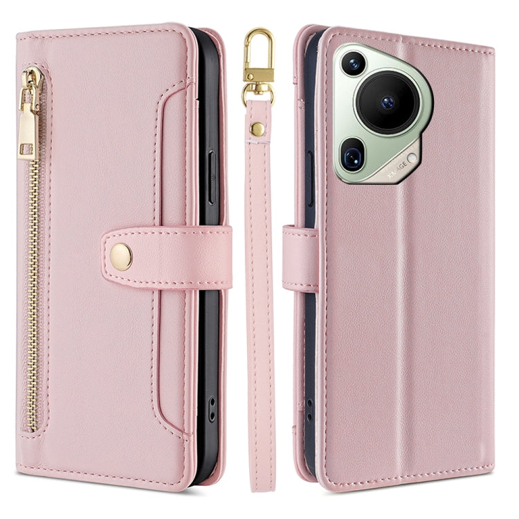 Funda de Cuero para Huawei Pura 70 Ultra 5G con Billetera, Cremallera y Textura de Oveja (Rosa)