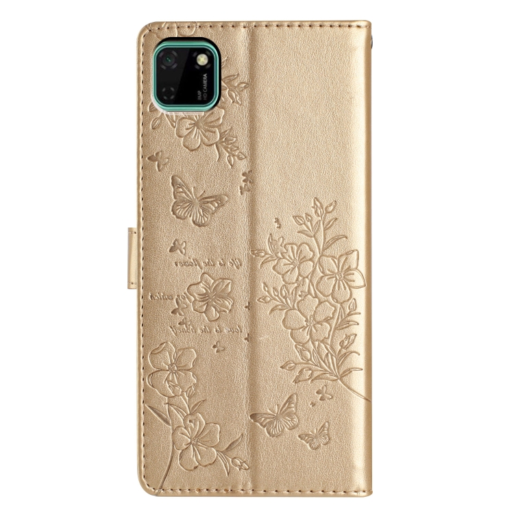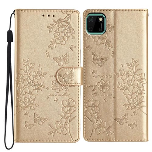 - 1x Funda para Huawei Y5P de Cuero con relieve de flor y mariposa (Dorado)