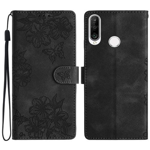 - 1x Funda para Huawei Y6P Cherry Blossom Butterfly Skin Feel de PU en Relieve (Negro)
