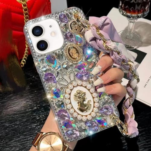 Caja de teléfono para iPhone 11 PC Pulsera Bufanda Piedra Preciosa Púrpura Diamante Hecho a mano (Blanco)