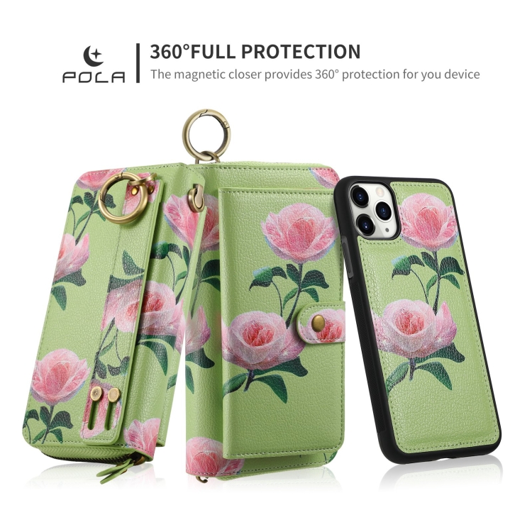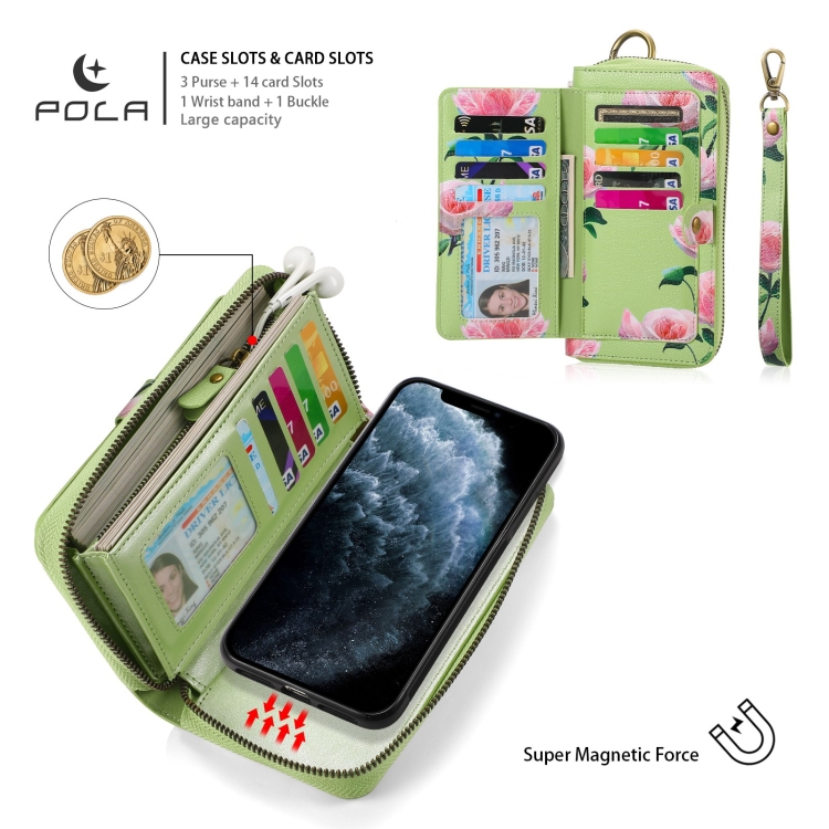 Funda para Teléfono iPhone 11 Pola Flower Cuero con Billetera y Cremallera Multifuncional (Verde)