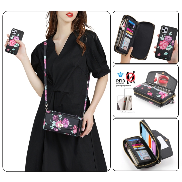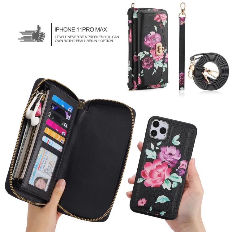 Funda para Teléfono iPhone 11 Pola Flower Cuero con Billetera y Cremallera Cruzada Multifuncional (Negro)