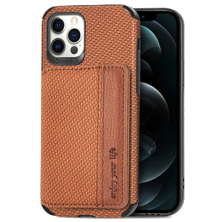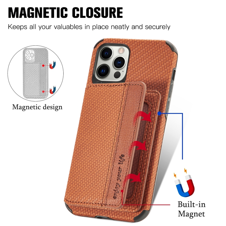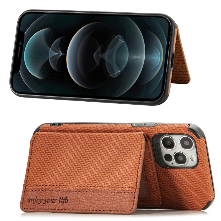 Funda Trasera para iPhone 11 Pro Fibra de Carbono TPU + PU con Bolsa Magnética, Soporte, Ranura para Tarjeta y Marco de Fotos (Marrón)