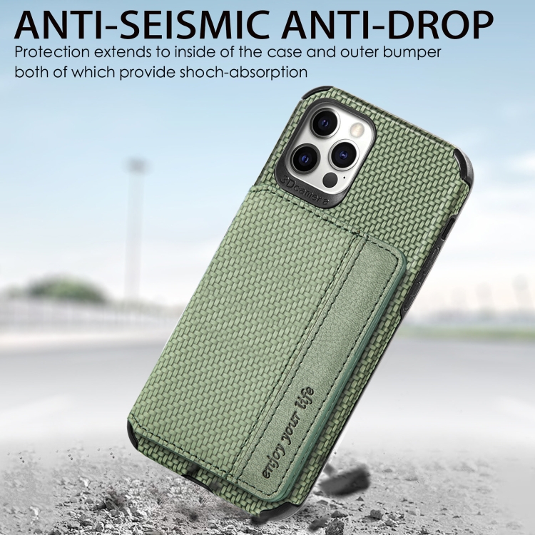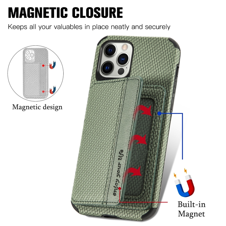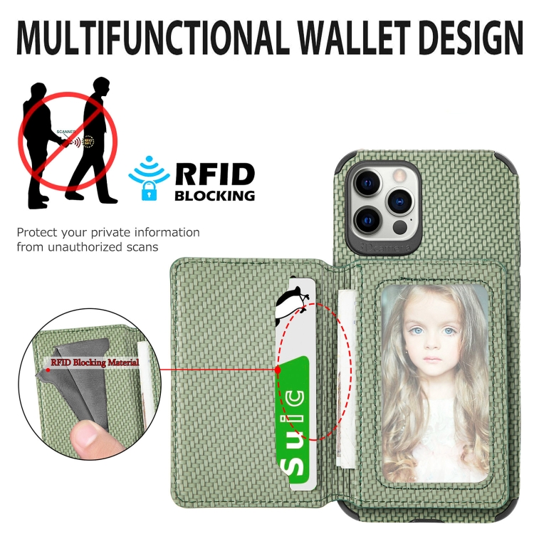 Funda Trasera para iPhone 11 Pro Fibra de Carbono TPU + PU con Bolsa de Tarjeta Magnética, Soporte, Ranura y Marco de Fotos (Verde)