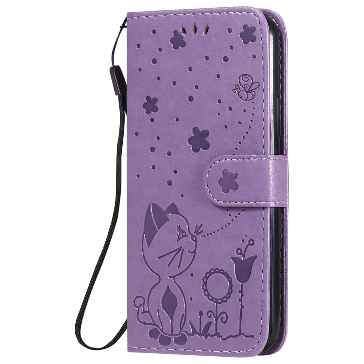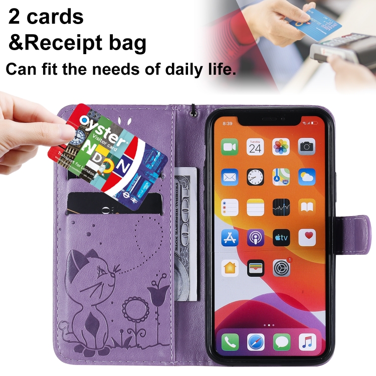Funda de Cuero iPhone 11 Pro Cat Bee Patrón En Relieve Tapa Horizontal Soporte Ranuras Tarjetas Billetera (Púrpura)