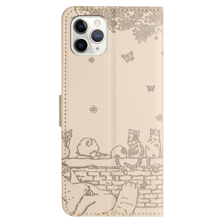 Funda para iPhone 11 Pro Max Cat Relieve Patrón Cuero con Cordón (Beige)