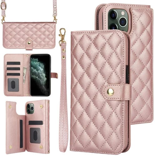 Estuche para Teléfono iPhone 11 Pro Max Crossbody Cuero Rómbico Multifunción (Oro Rosa)