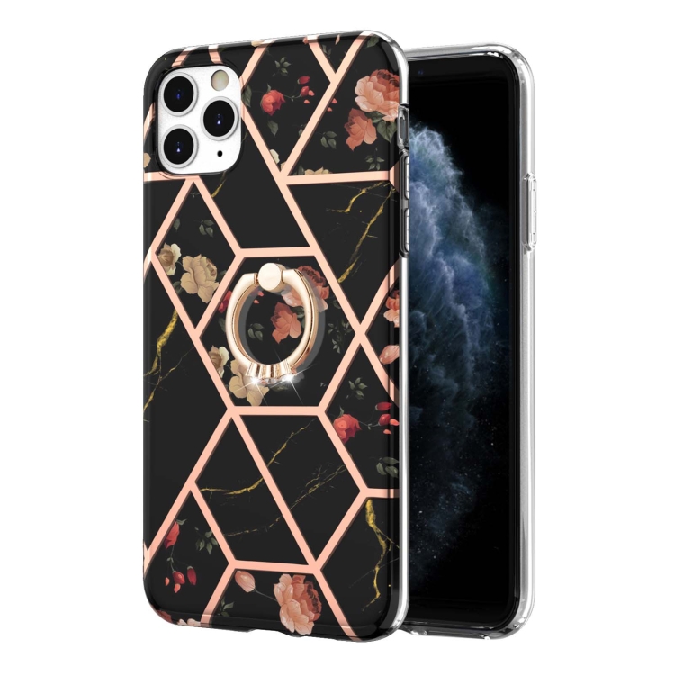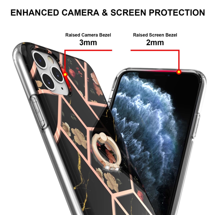 Funda TPU para iPhone 11 Pro Max Galvanoplastia Empalme Patrón Flor Mármol a Prueba de Golpes con Soporte Anillo Diamantes de Imitación (Flor Negra)