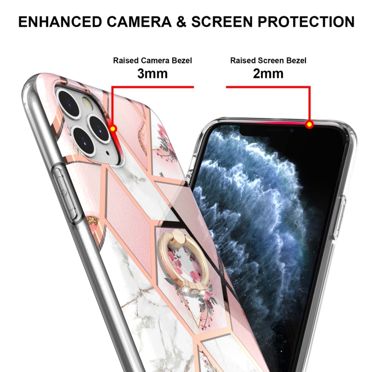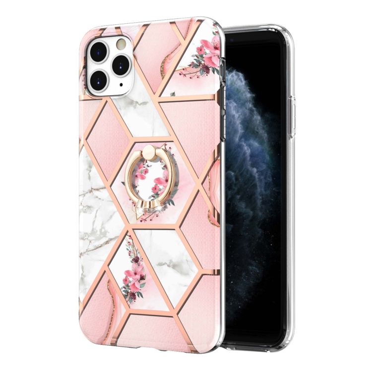 Funda para iPhone 11 Pro Max TPU Galvanoplastia Patrón Flor Mármol Soporte Anillo (Flor Rosa)