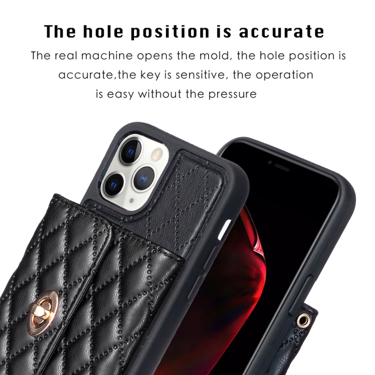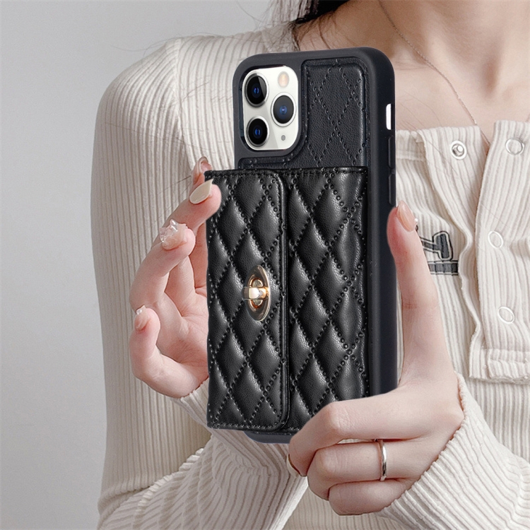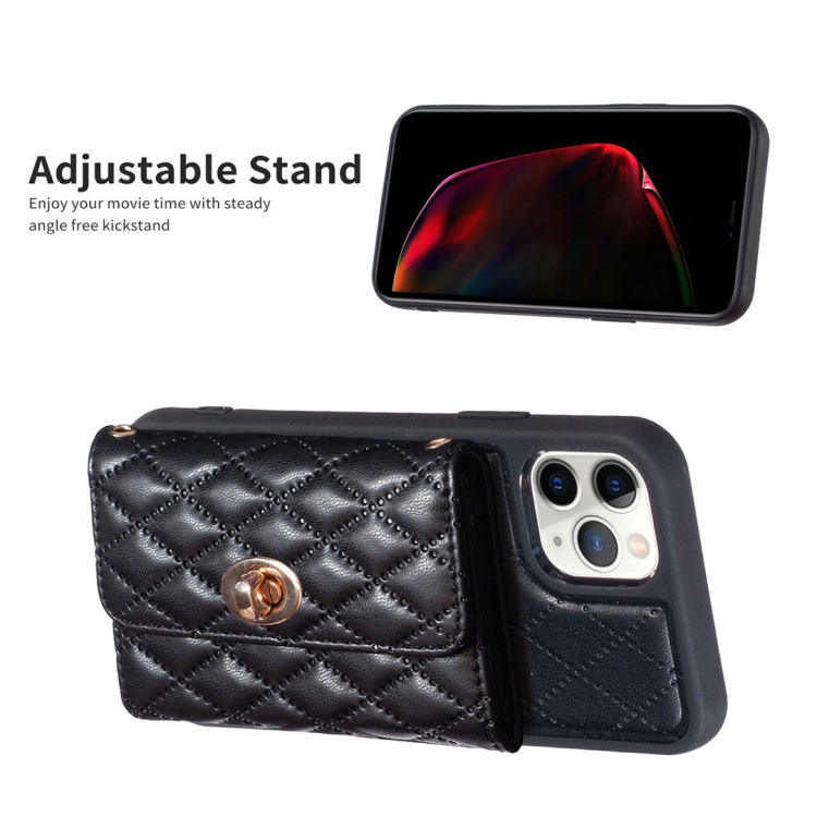 Funda para iPhone 11 Pro Max Horizontal Metal Hebilla Monedero Rombico Cuero (Negro)