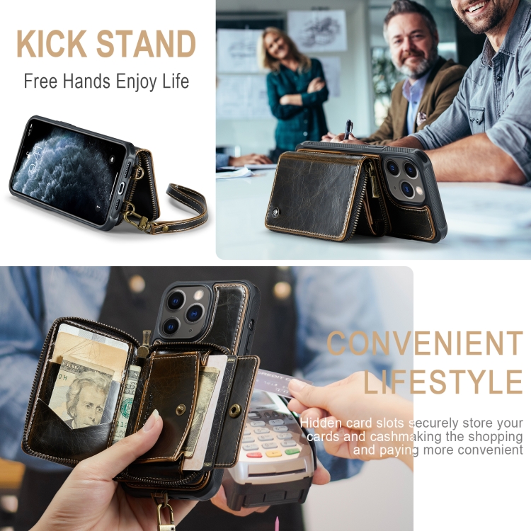 Funda de Cuero Jeehood C22 para iPhone 11 Pro Max con Cremallera Tipo Billetera y Doble Cordón (Café)