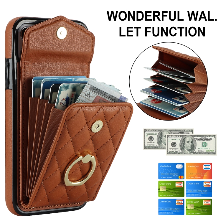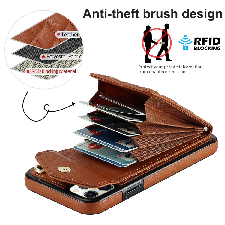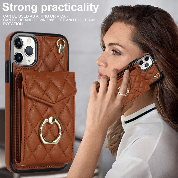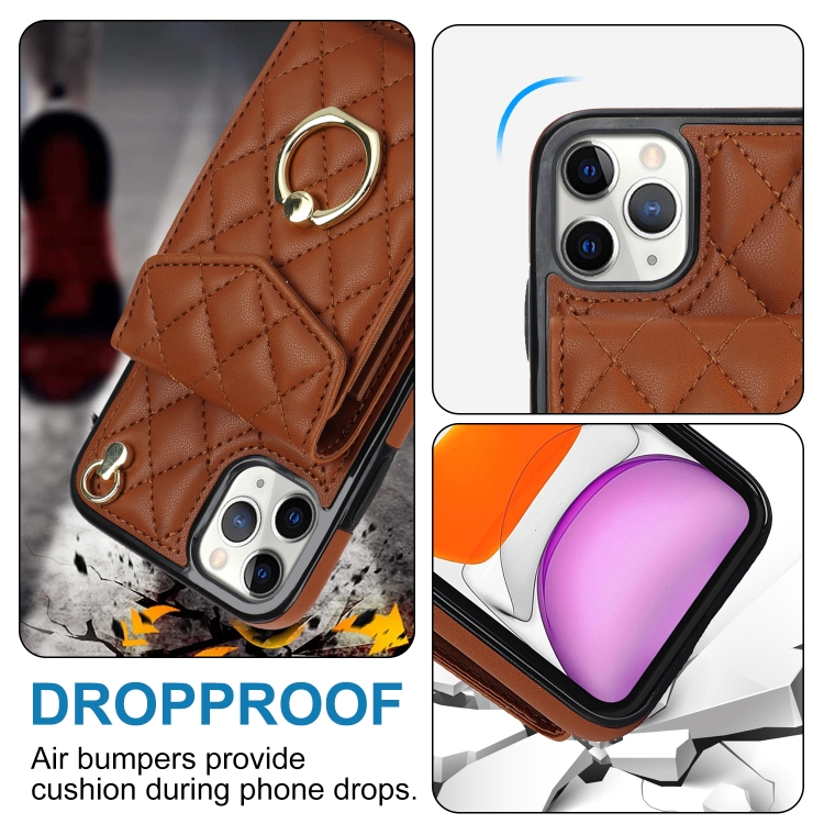 Funda para teléfono iPhone 11 Pro Max Rhombic Texture Card Bag con Cordón Largo (Marrón)