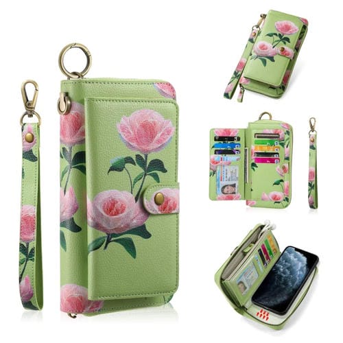 Funda de Cuero Pola Flower para iPhone 11 Pro con Billetera y Cremallera Multifuncional (Verde)