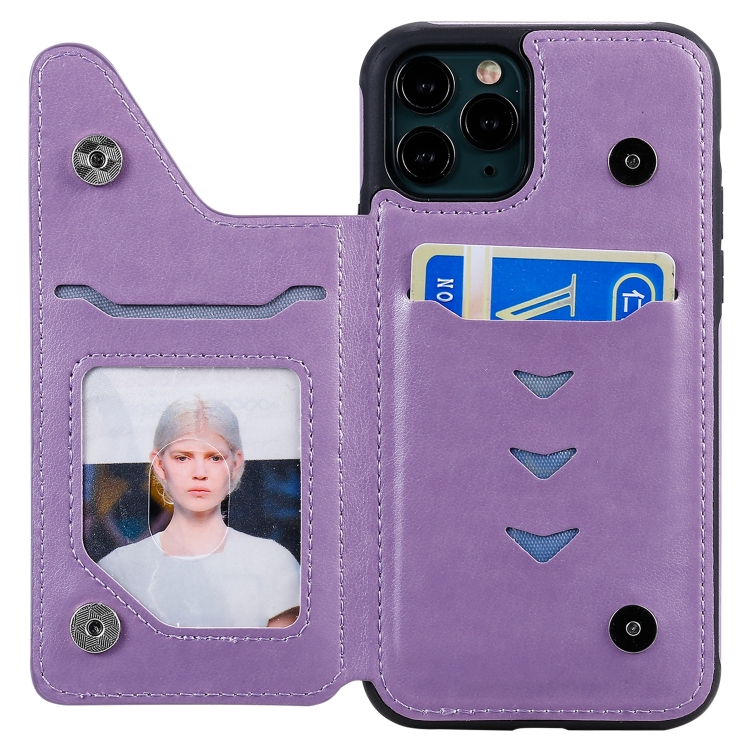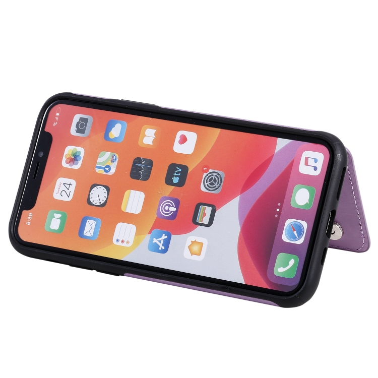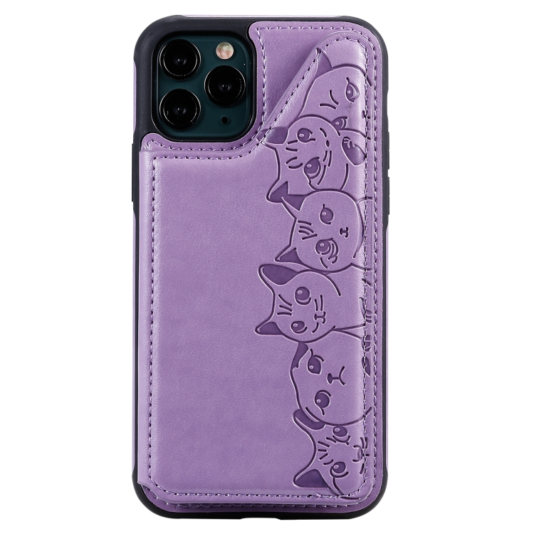 Estuche Protector Six Cats para iPhone 11 Pro con Patrón de Relieve, Soporte, Ranuras para Tarjetas y Marco de Fotos (Púrpura)
