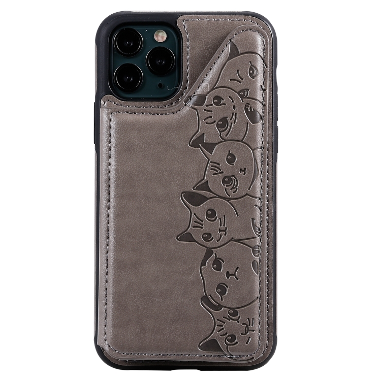 Estuche protector para iPhone 11 Pro Six Cats con patrón en relieve soporte ranuras para tarjetas y marco de fotos (Gris)