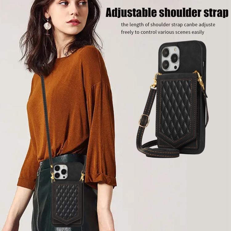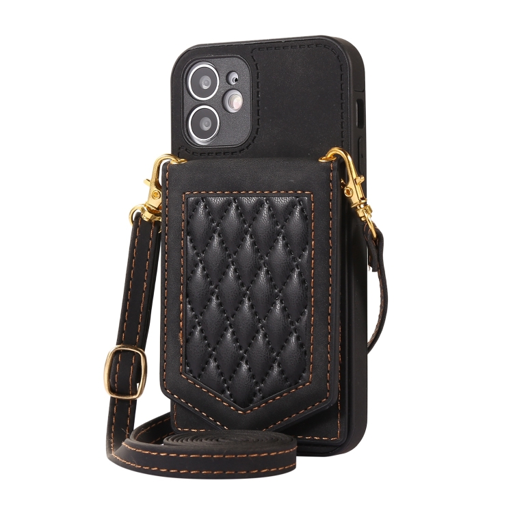 Funda para iPhone 11 Rhombic Texture Rfid con Cordón y Espejo (Negro)