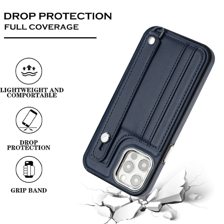 Funda de Teléfono iPhone 12 / 12 Pro Cuero a Prueba de Golpes con Correa para la Muñeca (Azul)