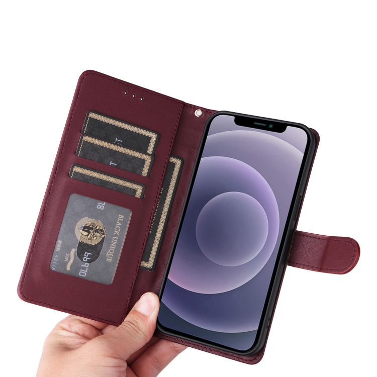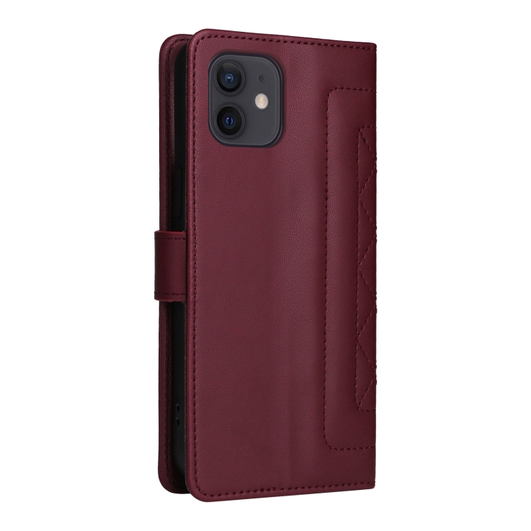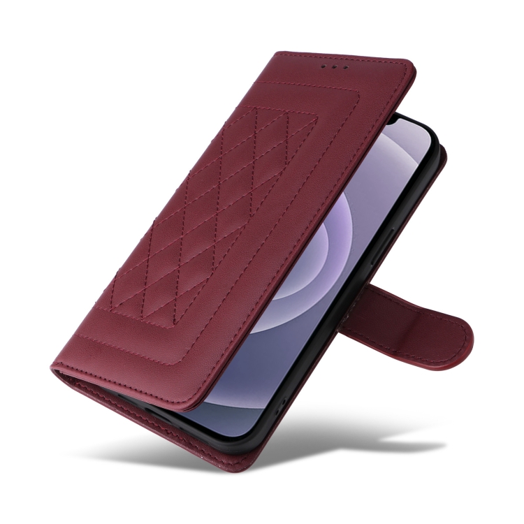 Funda para Teléfono iPhone 12/12 Pro con Tapa de Cuero Diamond Lattice (Rojo Vino)