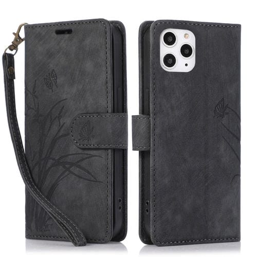 Funda para Teléfono iPhone 12/12 Pro Cuero Relieve Mariposa Orquídea (Negro)