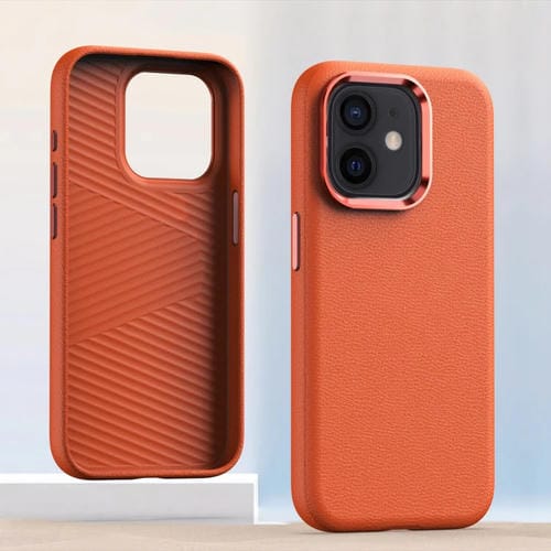 For iPhone 12 Full Coverage Shockproof Leather Phone Case with Metal Lens Frame (Orange)