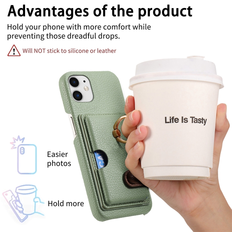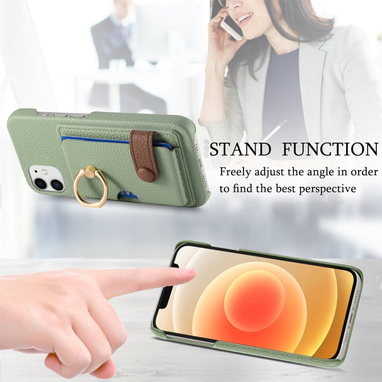 Funda para Teléfono iPhone 12 con Parte Posterior de Tarjeta y Anillo de Borde de Aceite de Cuero Litchi (Verde Té)