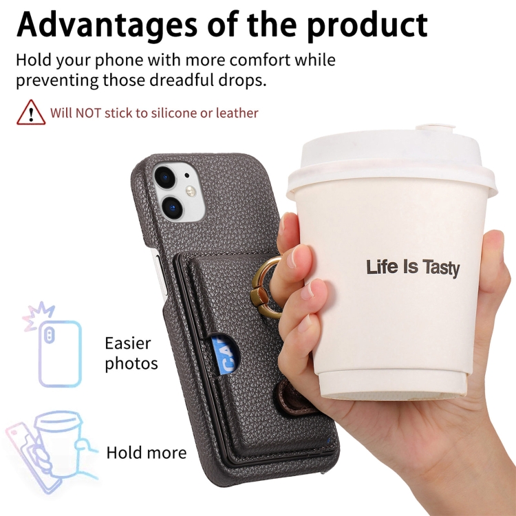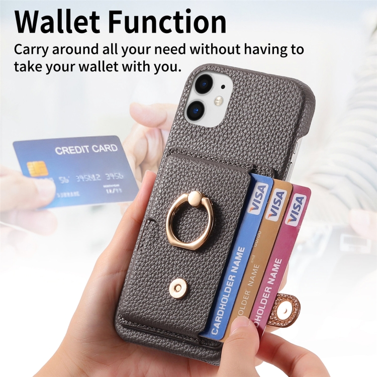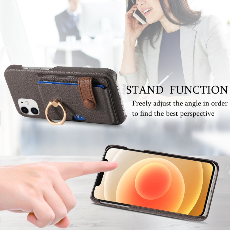 Funda para Teléfono iPhone 12 con Parte Posterior de Tarjeta con Anillo y Borde de Aceite de Cuero Litchi (Gris)