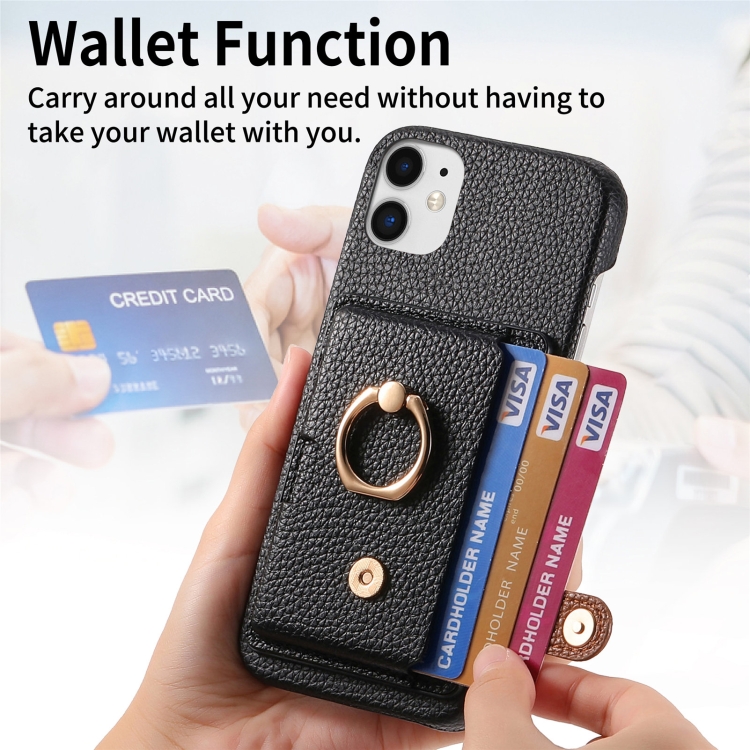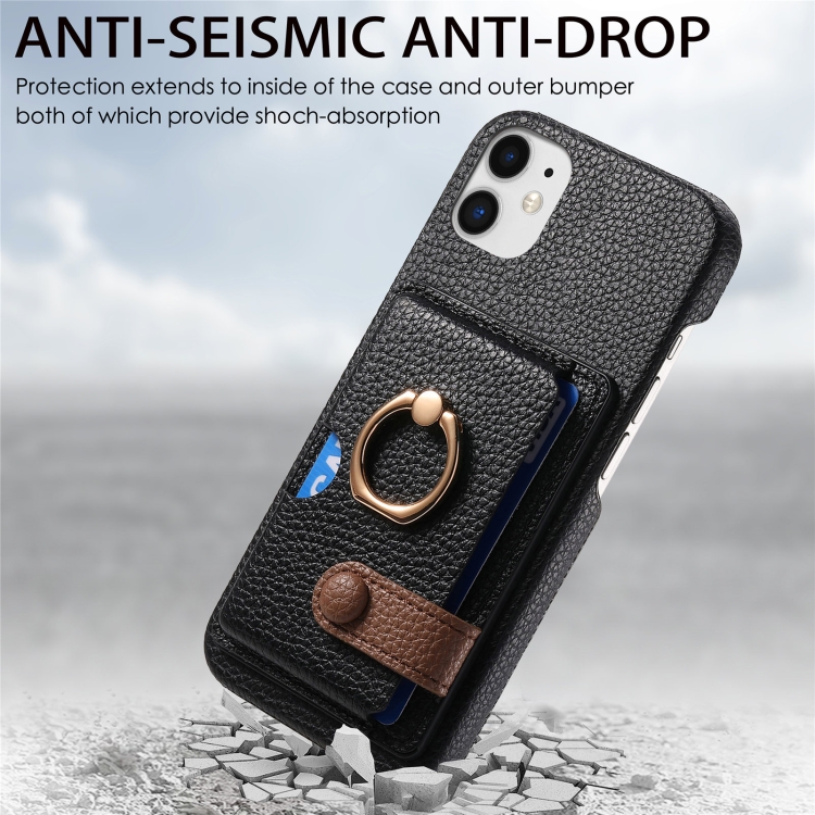 Funda para Teléfono iPhone 12 con Parte Posterior de Tarjeta y Anillo Borde de Aceite de Cuero Litchi (Negro)