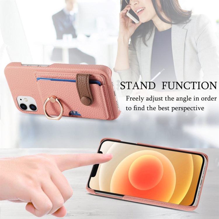 Funda para teléfono iPhone 12 con parte posterior de tarjeta con anillo y borde de aceite de cuero Litchi (Rosa)